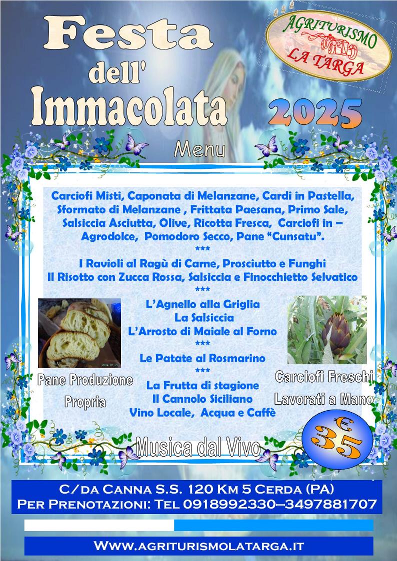 Cerda, provincia di Palermo Un’occasione di festa e divertimento, il pranzo dell’Immacolata 8 Dicembre 2023 Non perdere l’occasione di festeggiare il giorno dell’Immacolata con un pranzo gustoso e prelibato preparato dai nostri chef. L' Agriturismo La Targa è felice di invitarvi al Pranzo dell’Immacolata presso la sua sala ricevimenti di Termini Imerese, Palermo, per trascorrere una giornata di festa intorno ad una tavola con amici e parenti, in Relax, nel totale benessere e a diretto contatto con la Natura.. Menu Fisso € 35