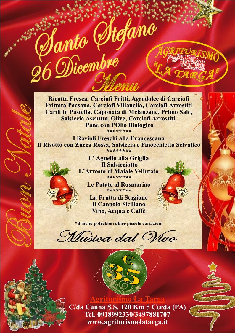 Un’occasione di festa e divertimento, il pranzo del 26 Dicembre 2025. Non perdere l’opportunità di passare una giornata in buona compagnia e di festeggiare il giorno del Santo Stefano con un pranzo gustoso e prelibato preparato dai nostri chef. L' Agriturismo La Targa è felice di invitarvi al Gran Pranzo del 26 Dicembre presso la sua sala ricevimenti di Cerda/Termini Imerese, Palermo. Menu Fisso € 35